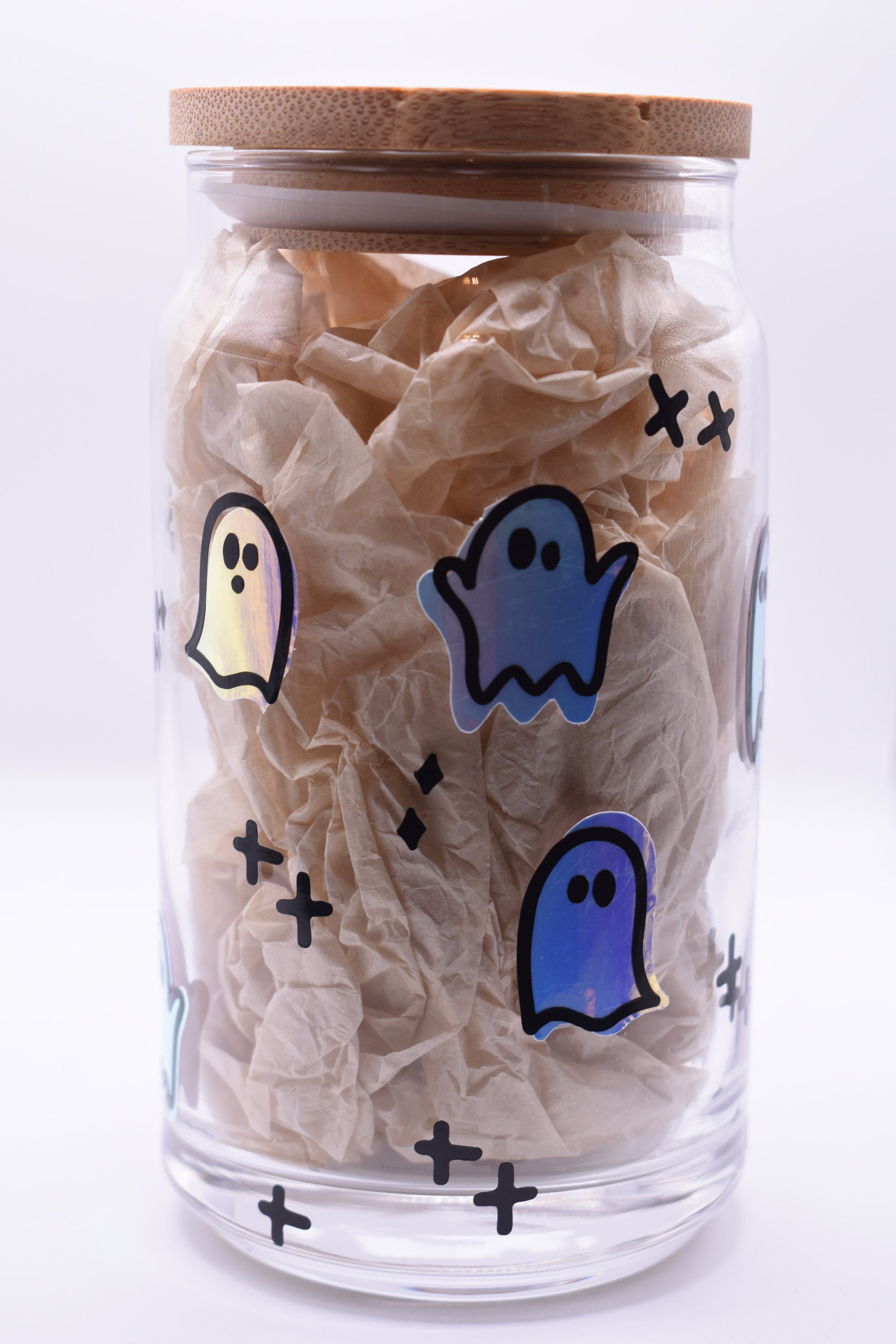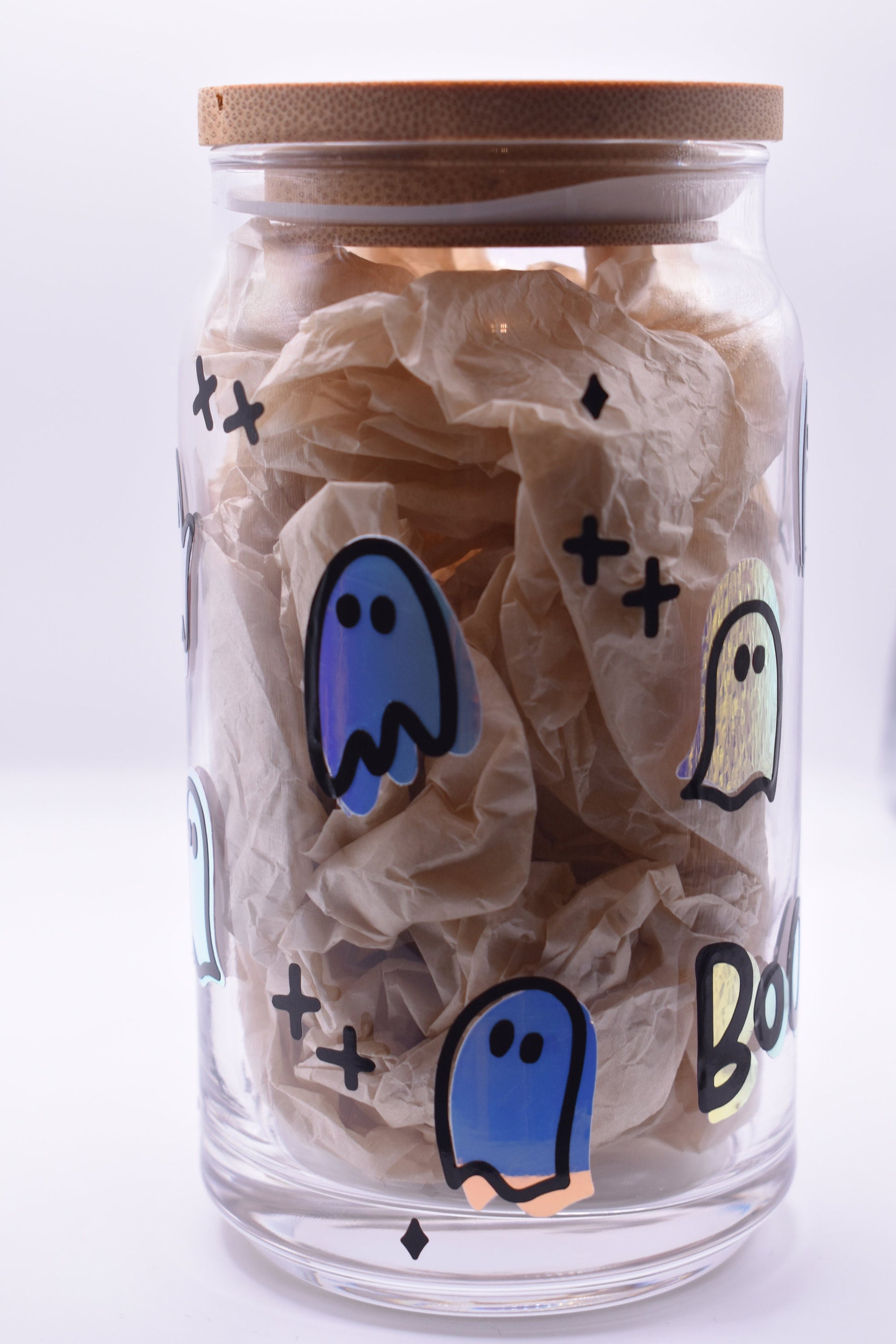Boo Ghost beer can glass cup 16 oz. Feel fabulous while drinking out of this spooky cup. All glass cups come with bamboo lid and glass straw.