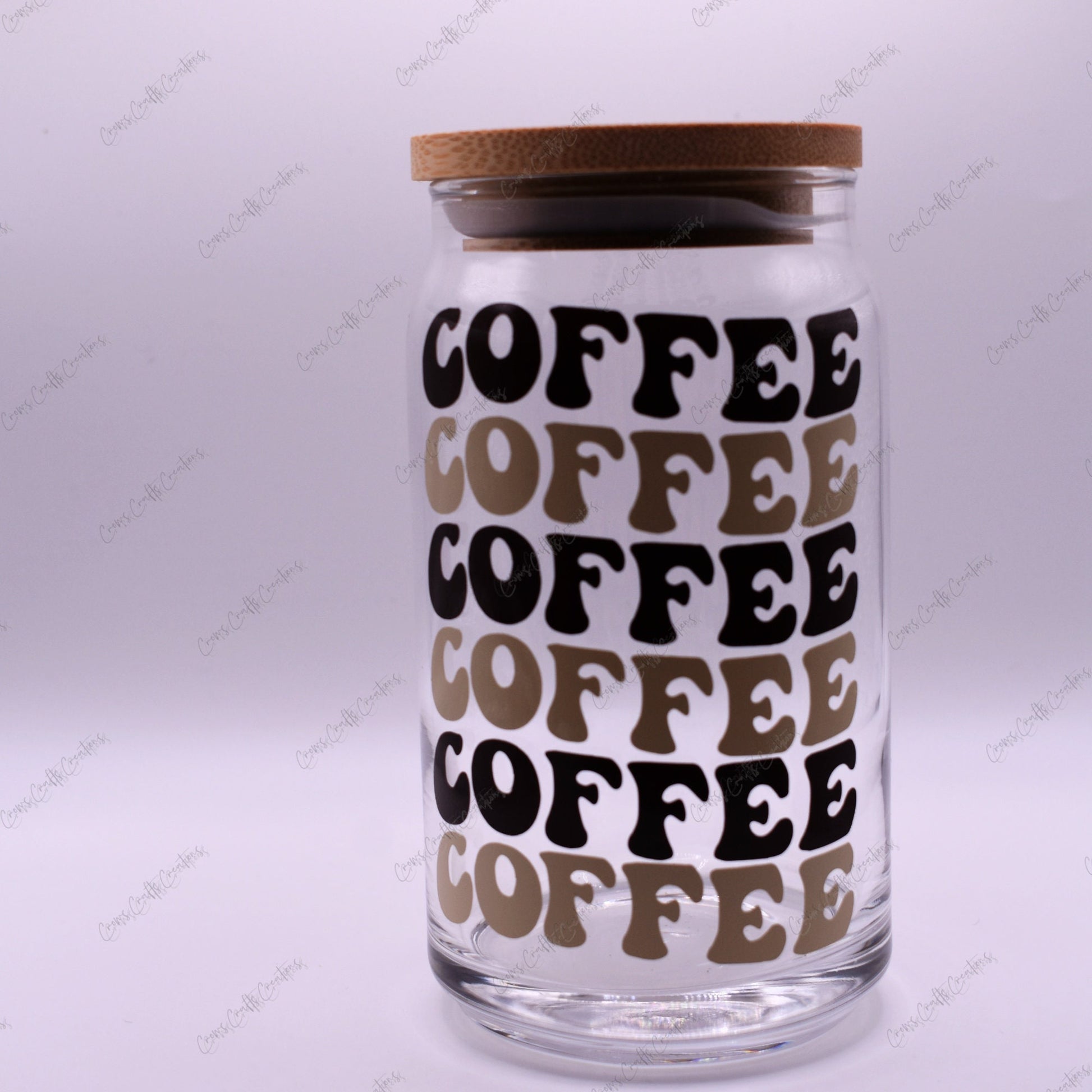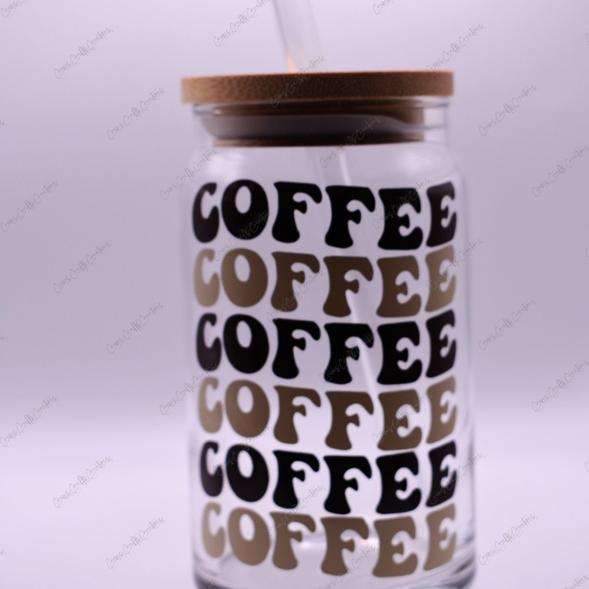 Coffee glass cup. Cute natural decal colors. Comes with glass straw and bamboo lid. Cup is 16oz.