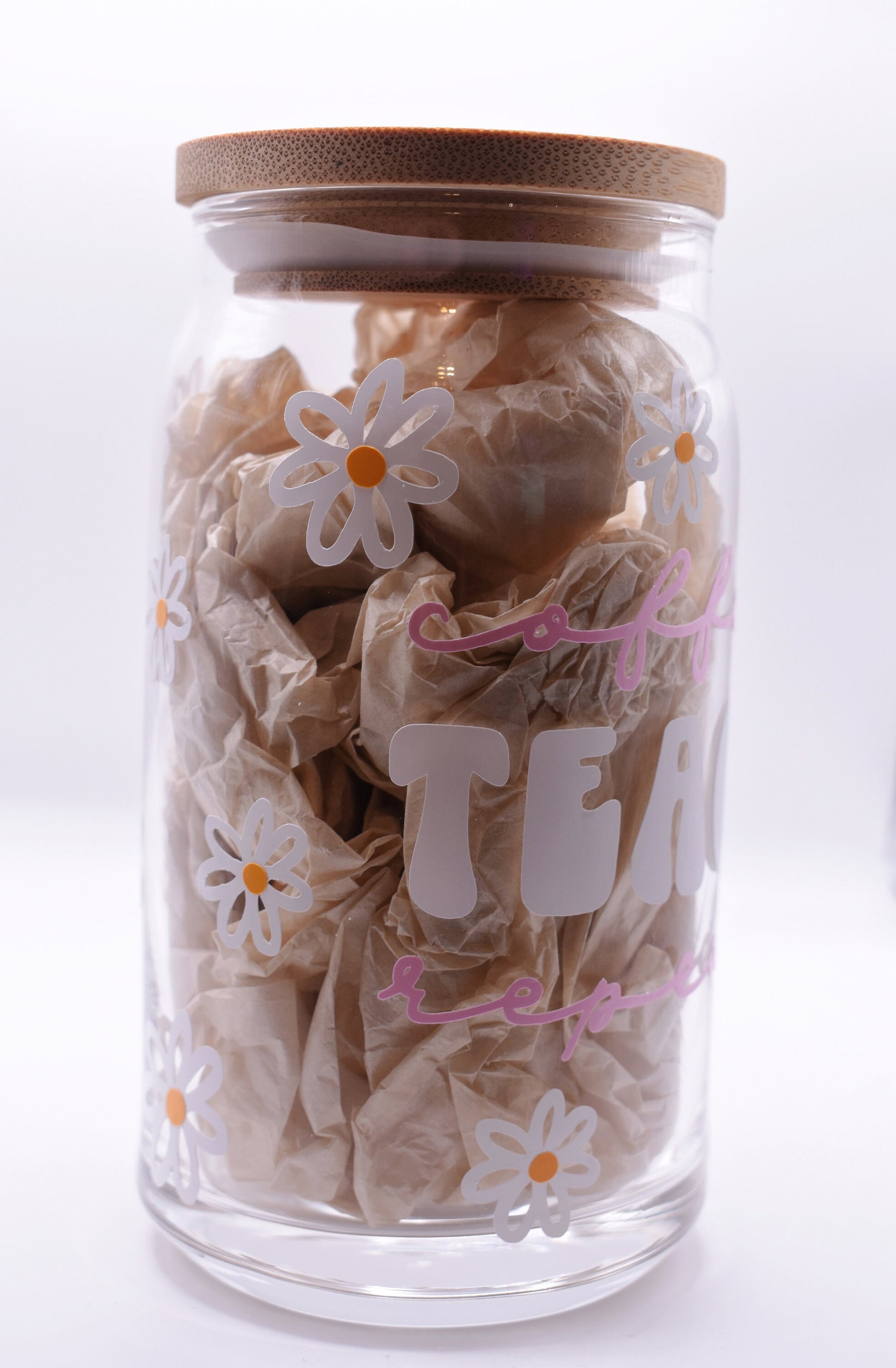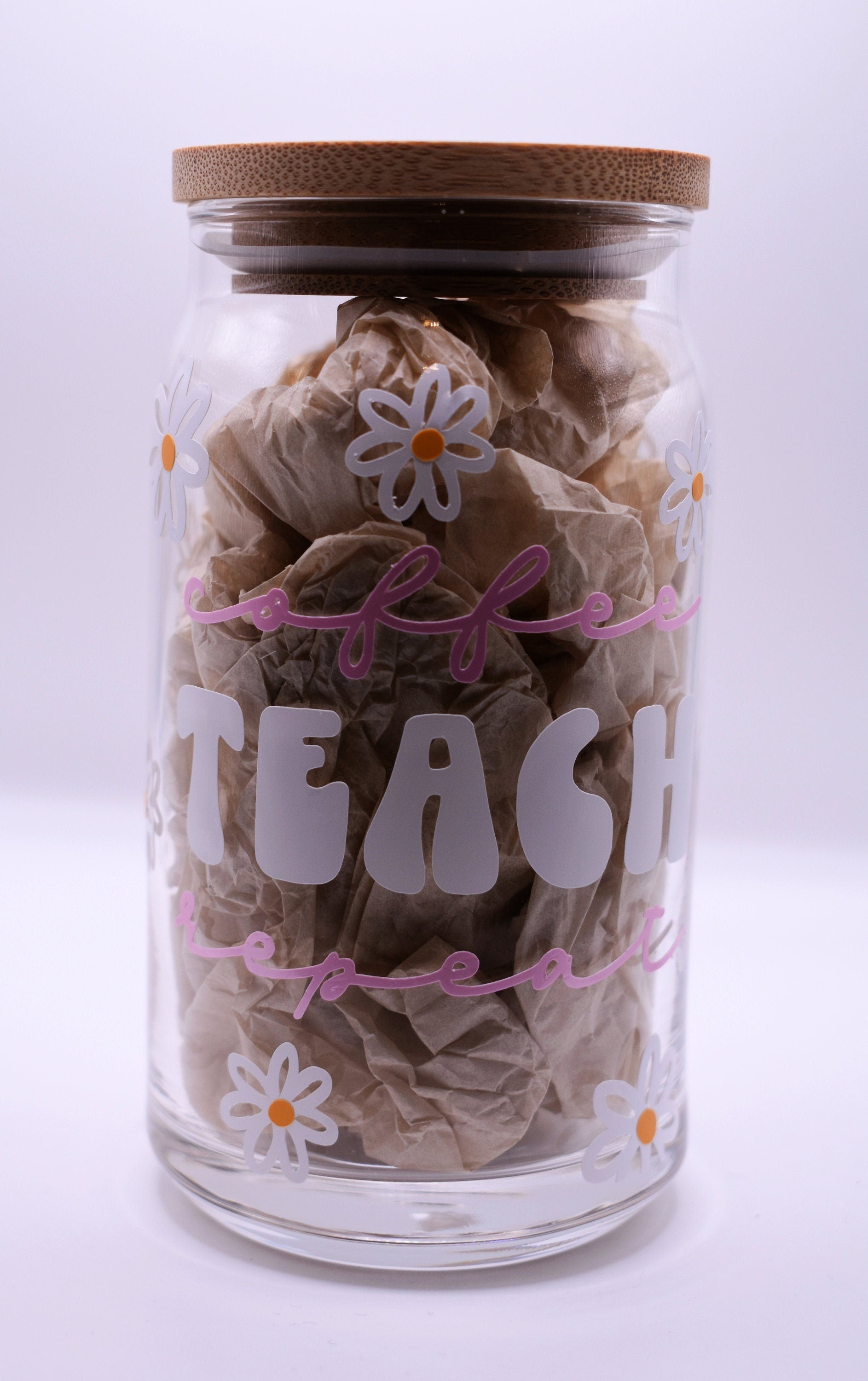Coffee Teach Repeat beer can glass cup 16 oz. Feel fabulous while drinking out of this statement cup. All glass cups come with bamboo lid and glass straw.