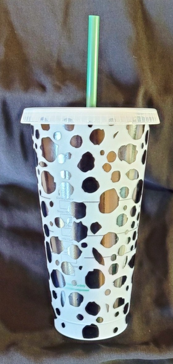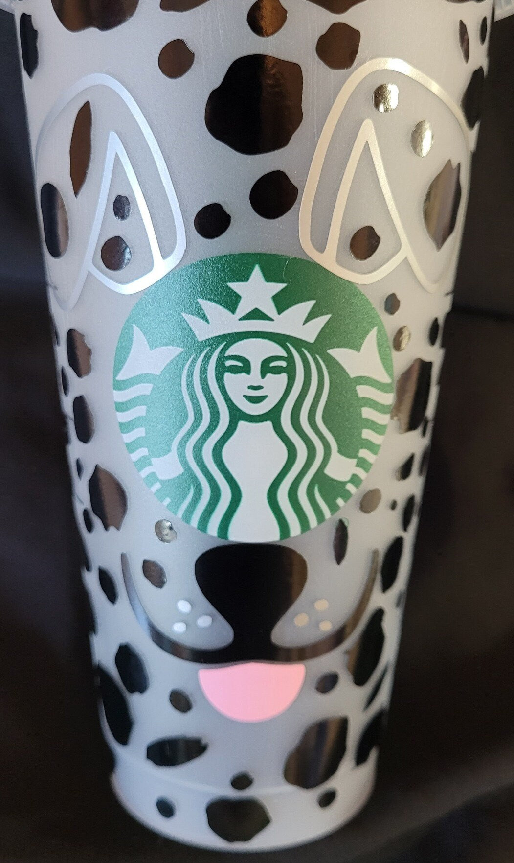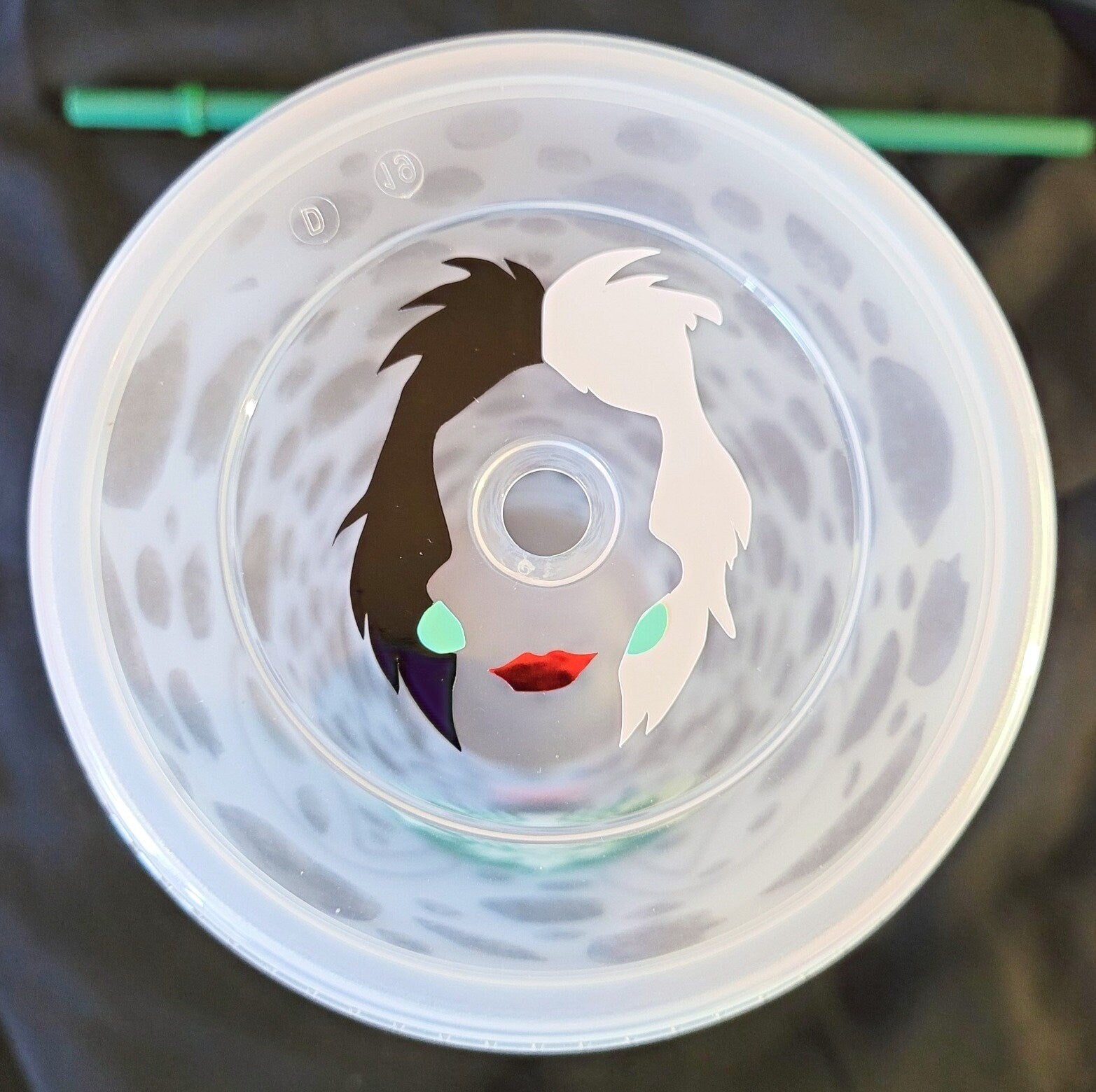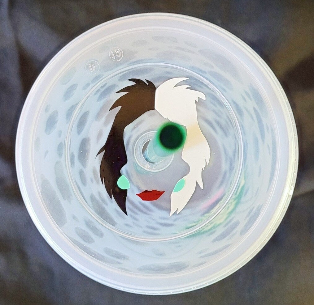 Cruella De Vil Starbucks reusable cup (24 oz). Dalmatian front with Cruella De Vil outline on top lid.