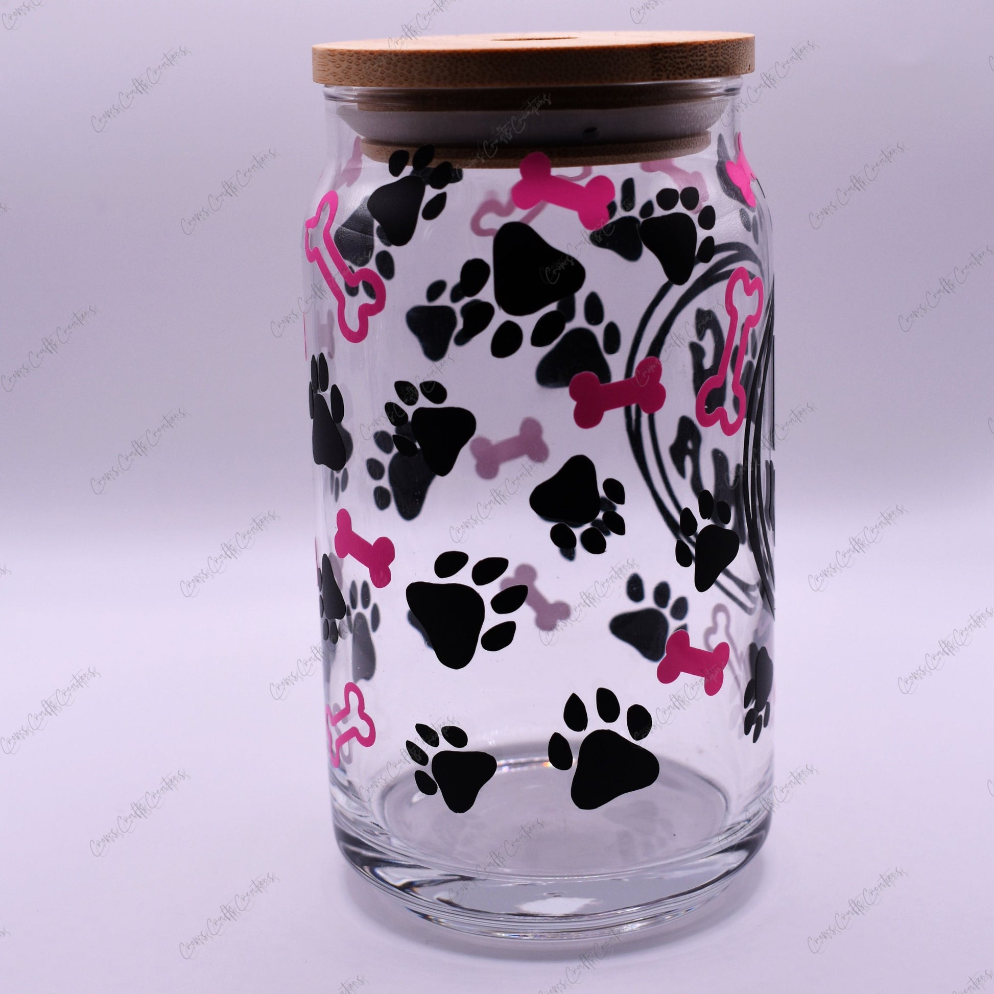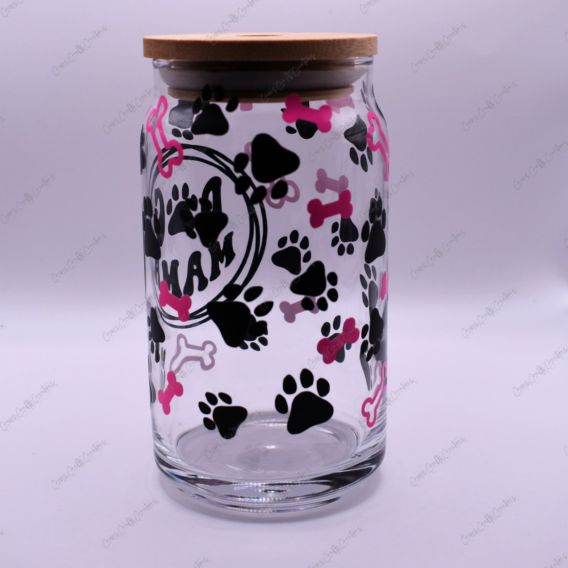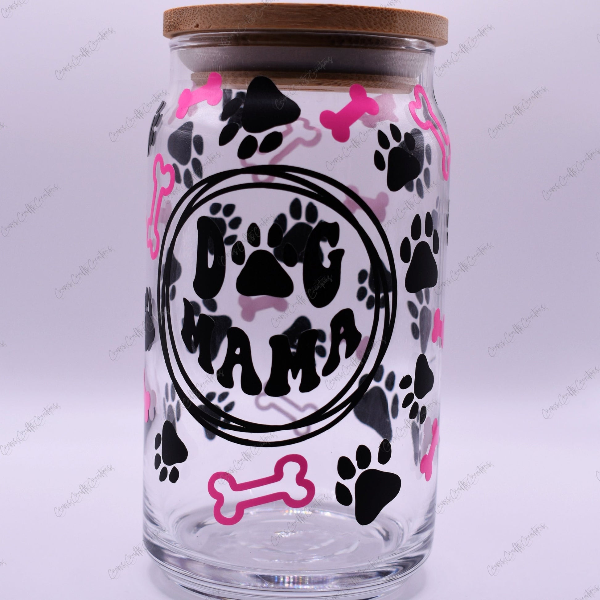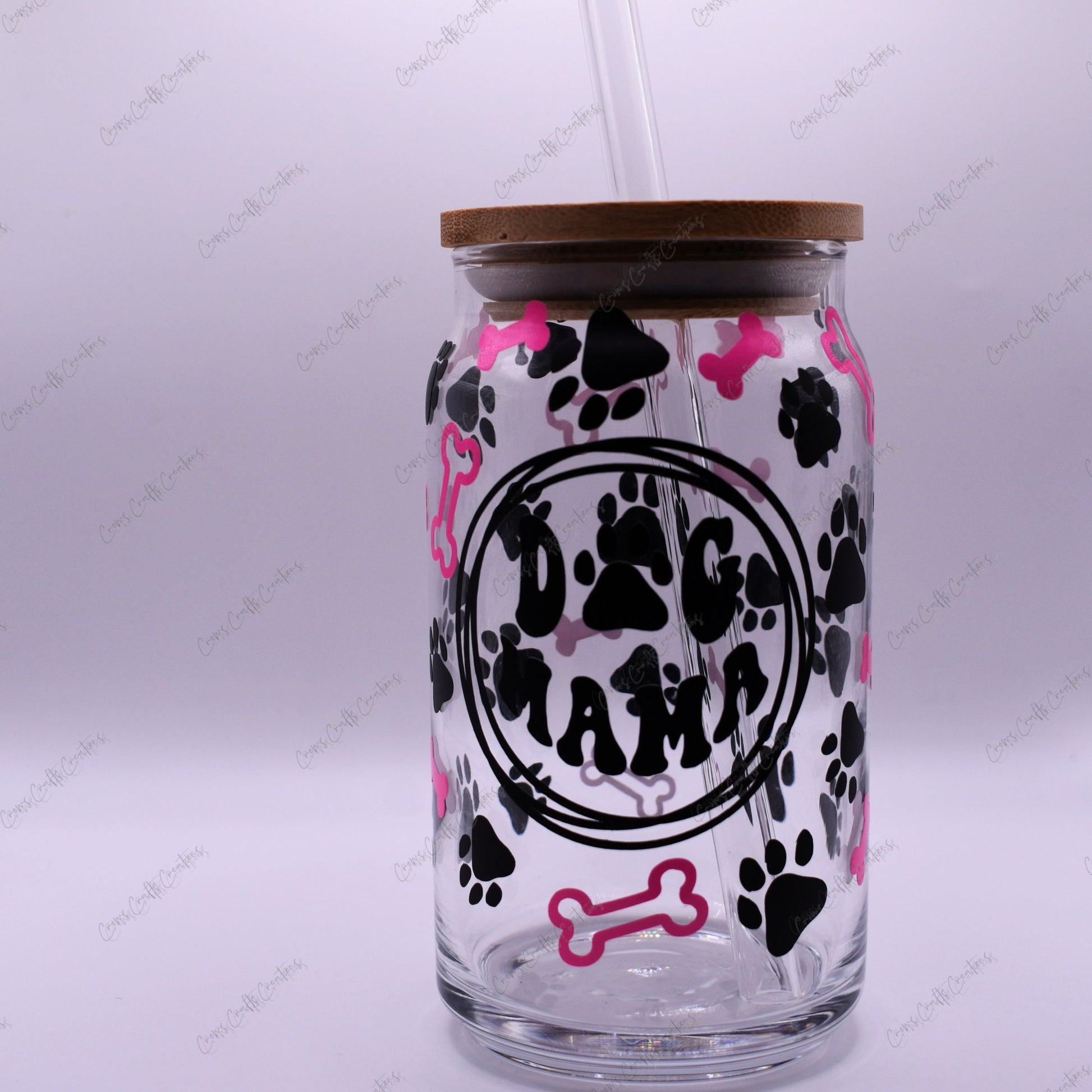 Dog Mama glass cup. This cup color changes with ice cold drinks! Comes with bamboo lid and glass straw. Cup is 16oz.