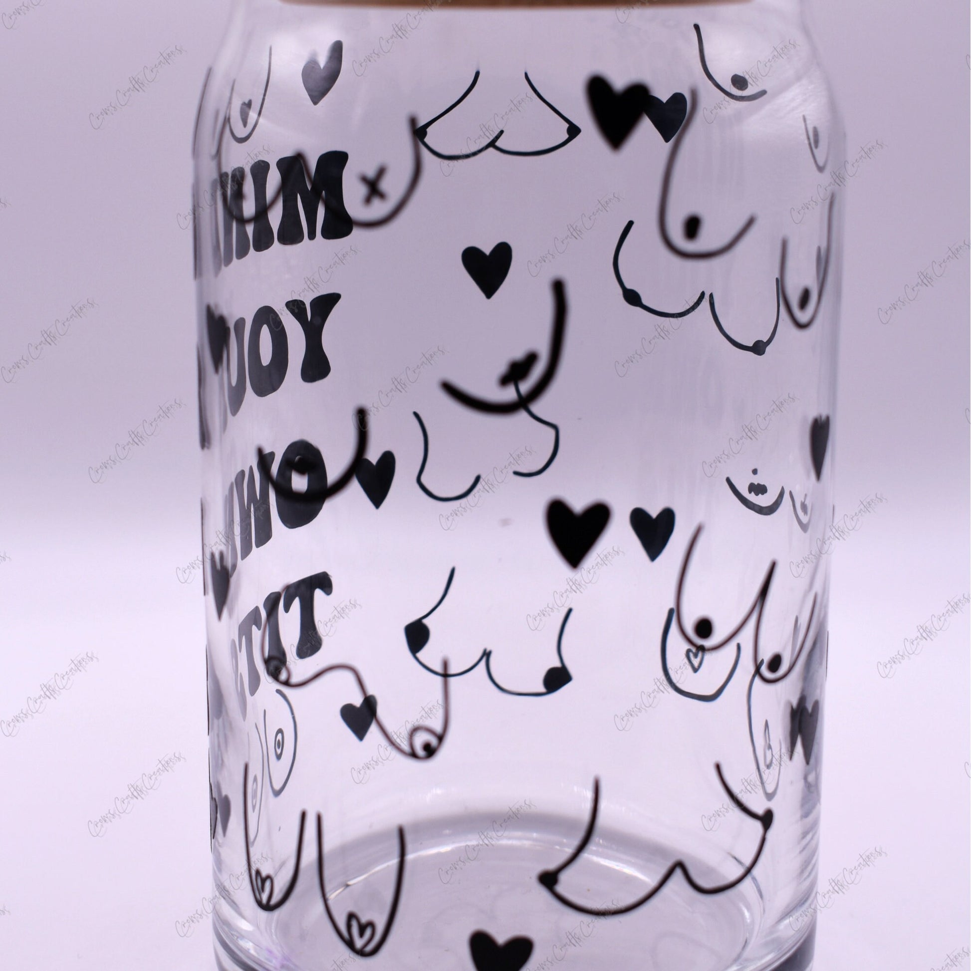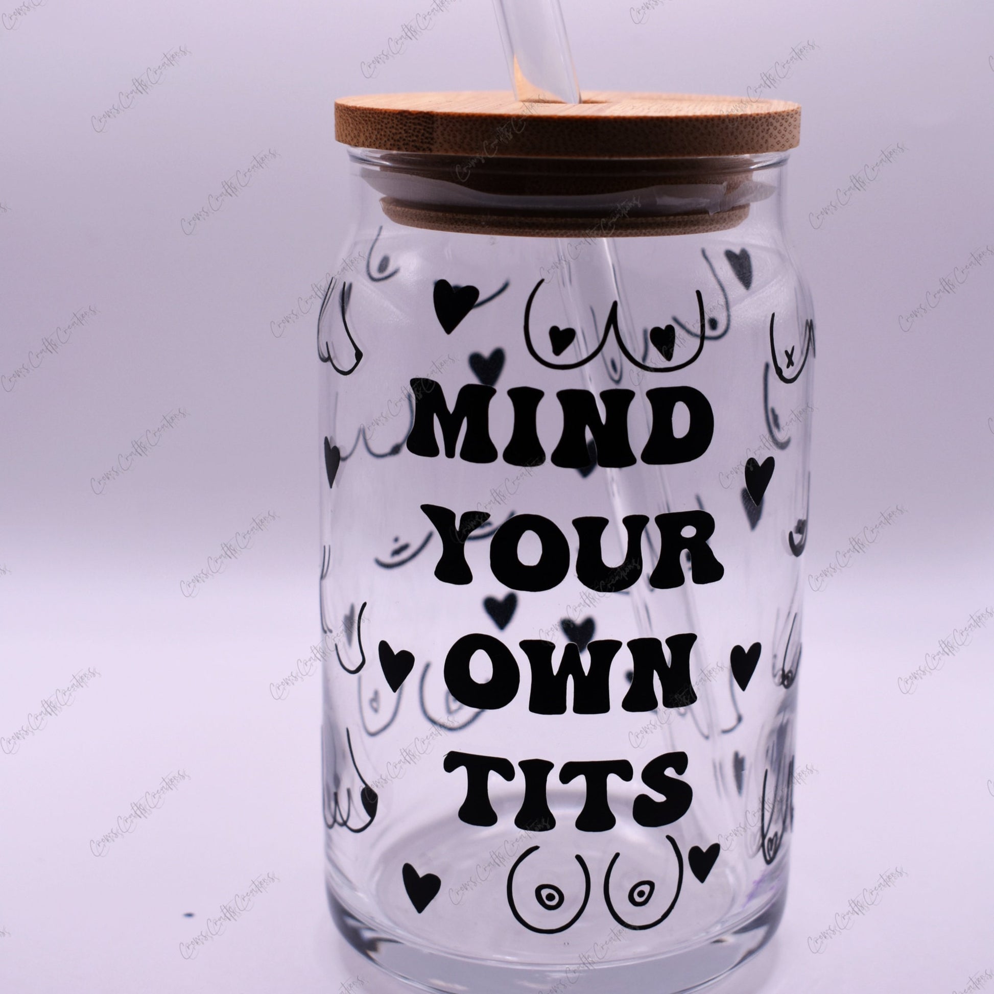 Mind Your Own Tits glass cup. Comes with bamboo lid and glass straw. Cup is 16oz.