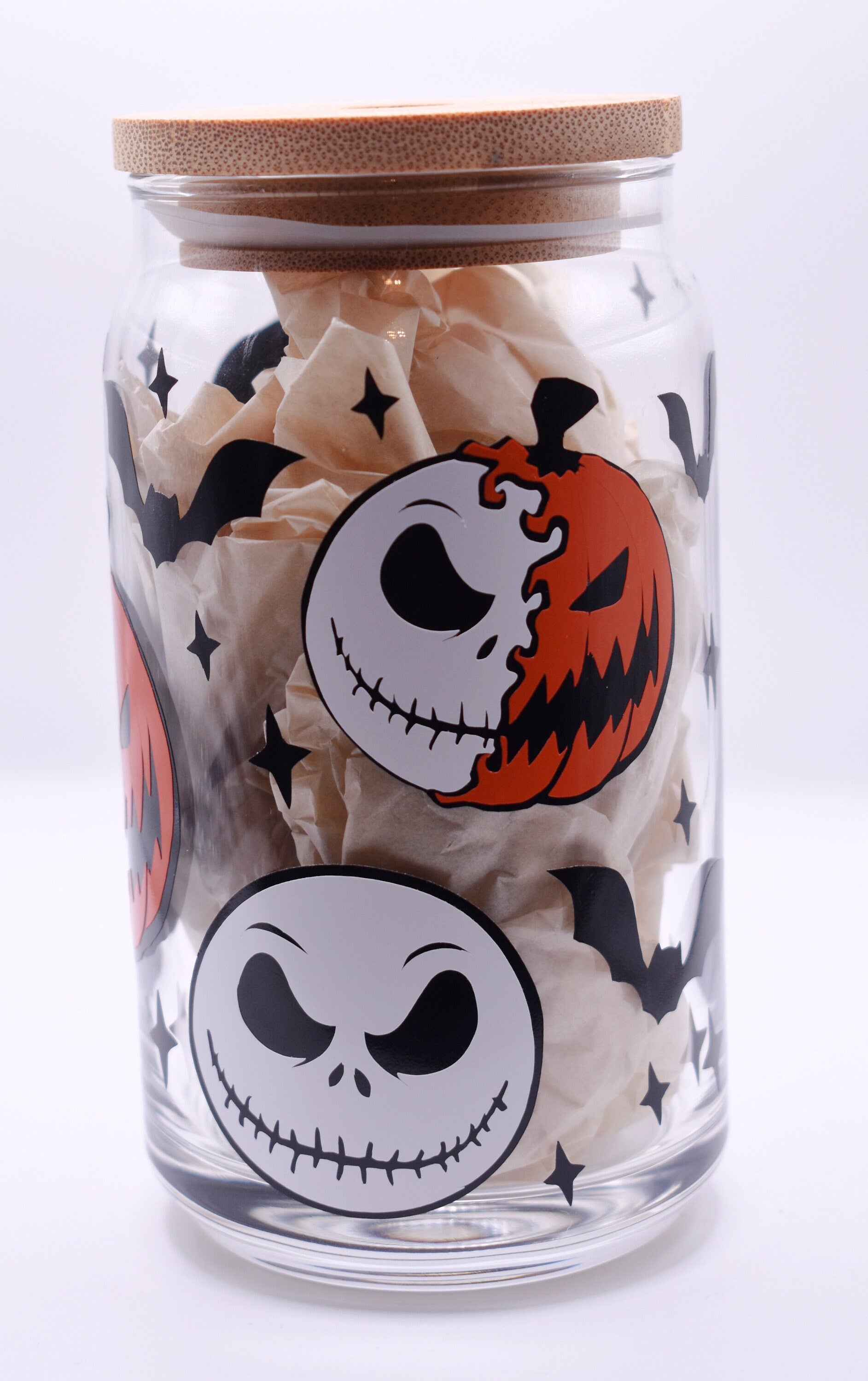 Pumpkin King glass cup 16 oz. Feel fabulous while drinking out of this spooky glass. All glass cups come with bamboo lid and glass straw.