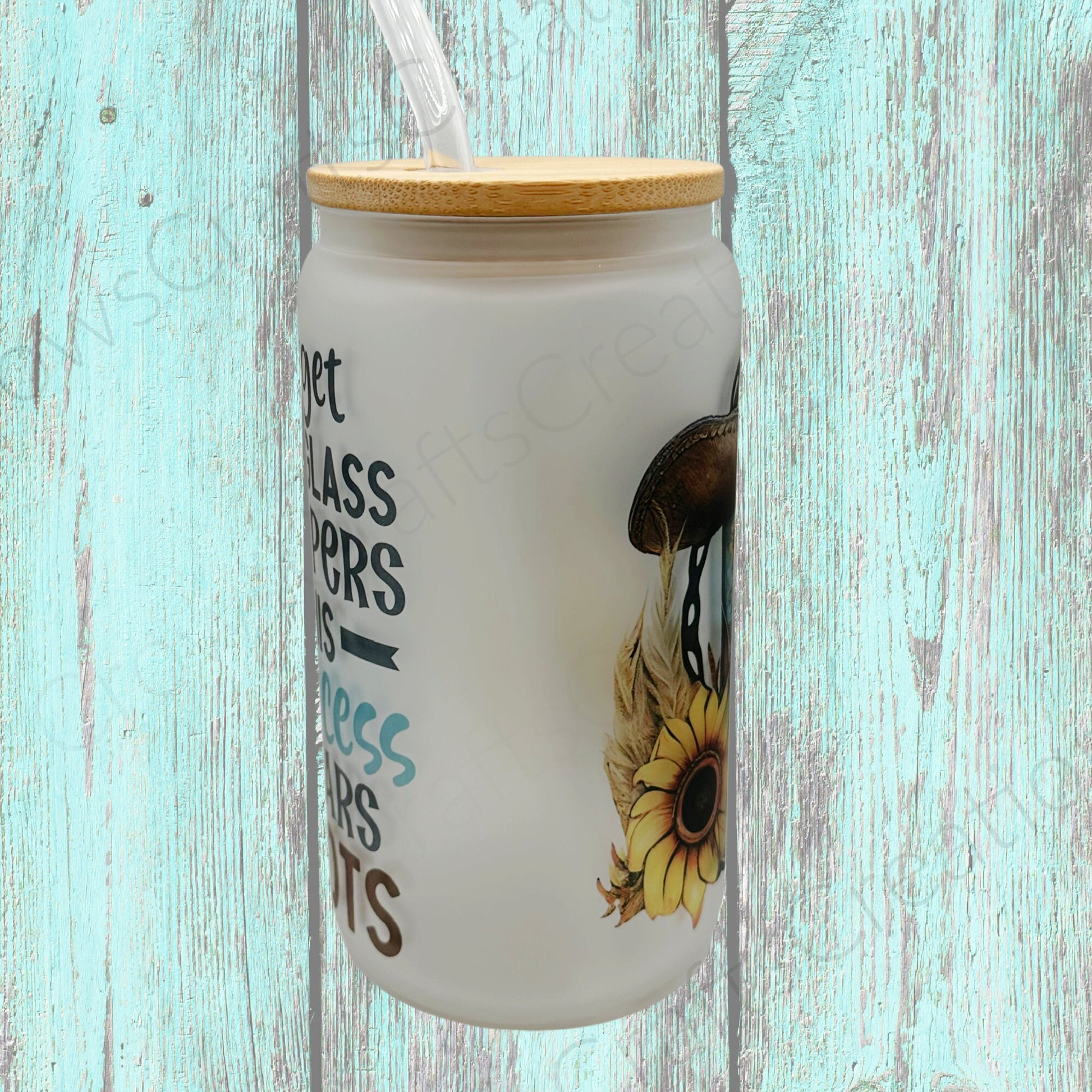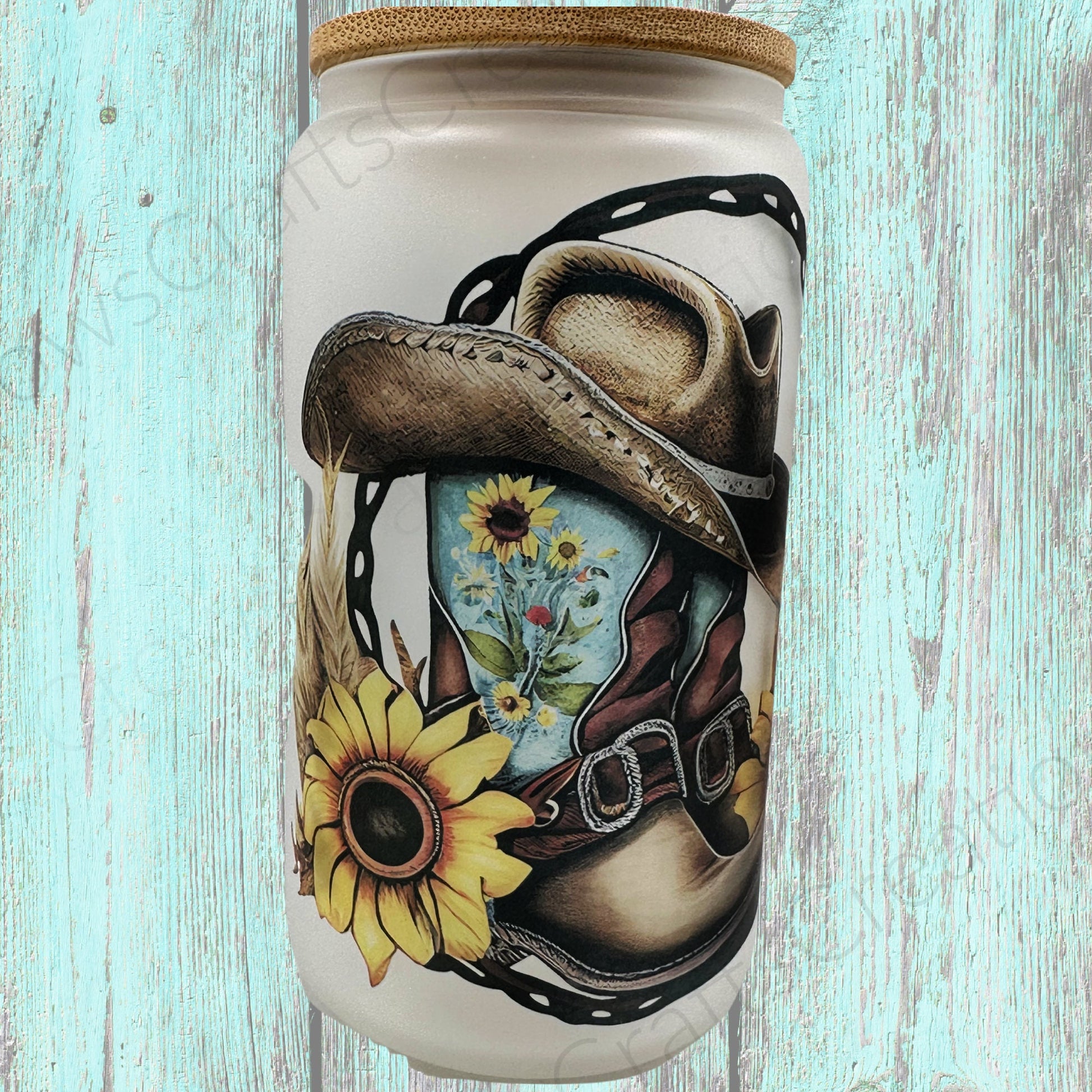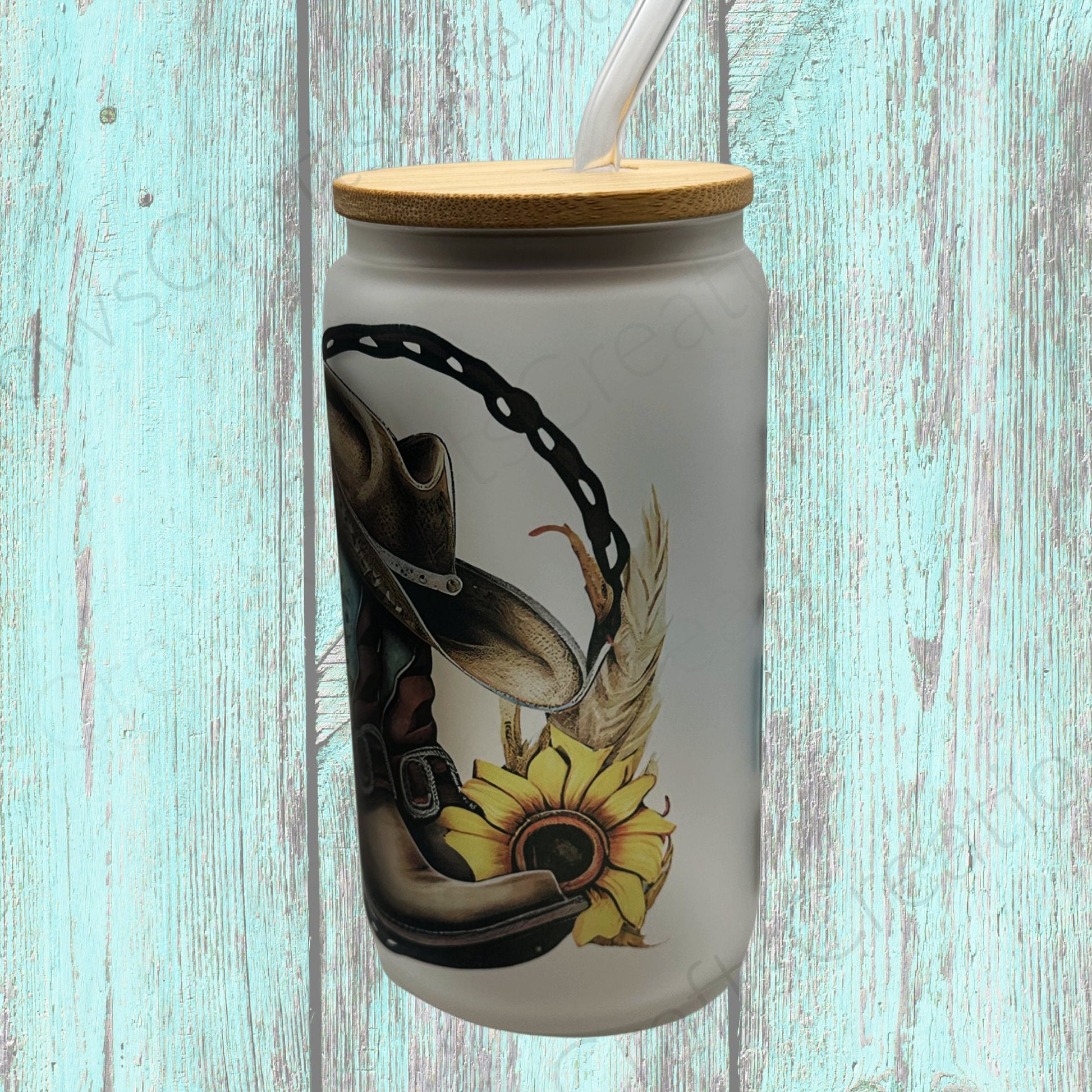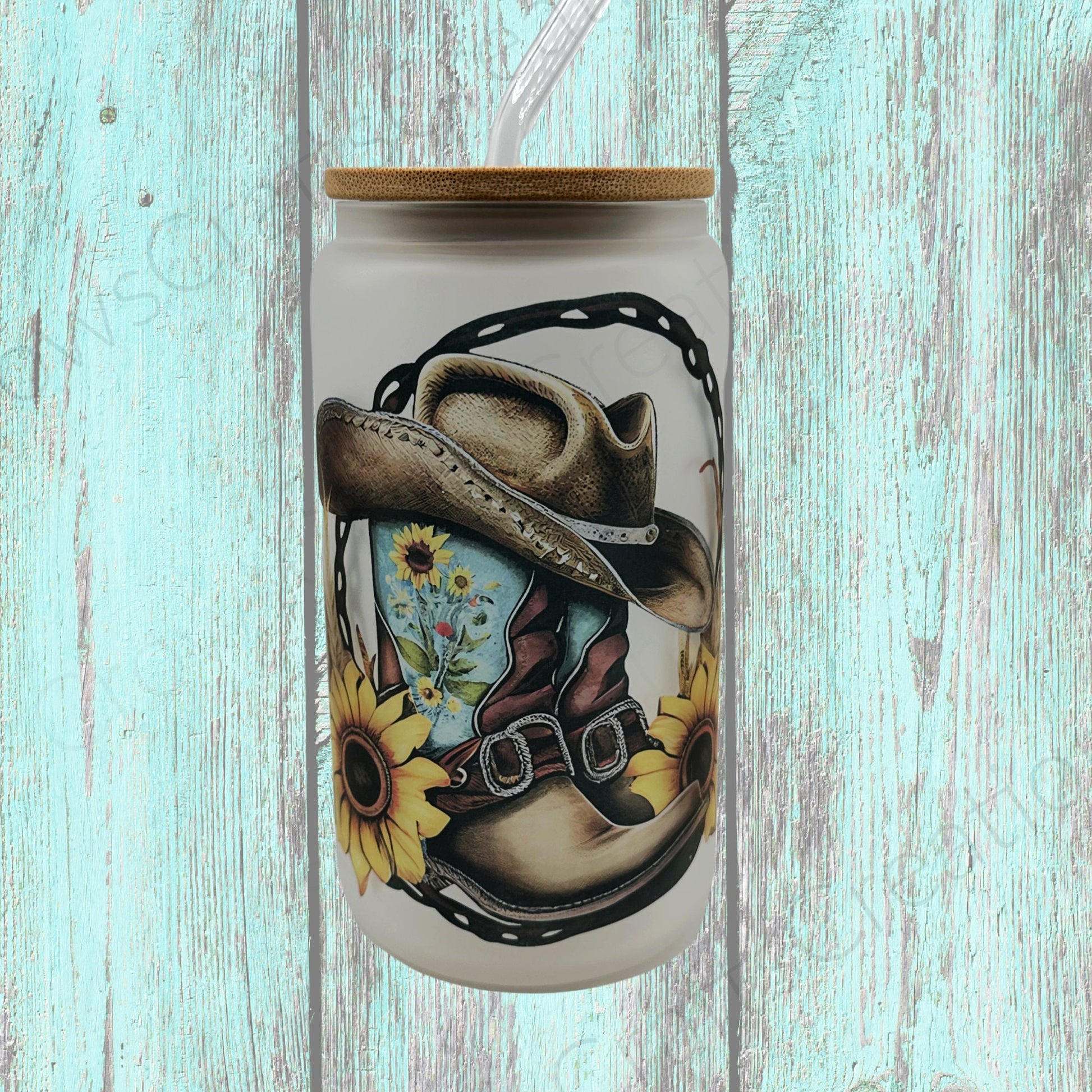 Sunflower Western Sublimation glass cup. Drink your iced coffee or margarita in this adorable delicate sunflower western glass cup. Comes with bamboo lid and glass straw. Glass is 16 oz.