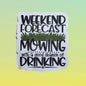 Weekend forecast mowing with a good chance of drinking sticker. Waterproof 3.4 in x 3.9in. Makes great gifts for the mower in your life. Good for hard hats, signs, water bottles, laptops etc...